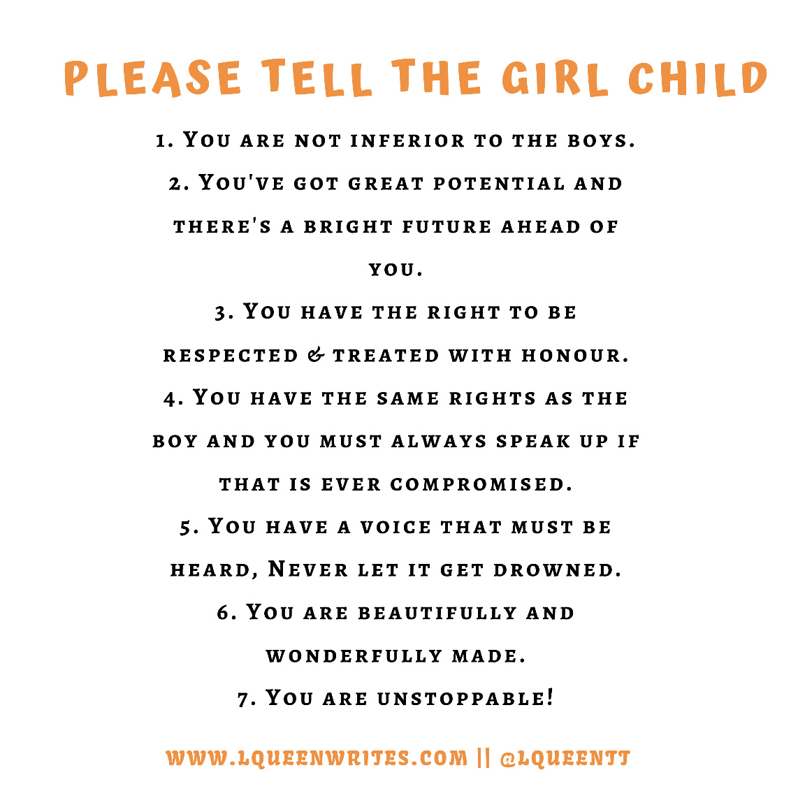 Teachers, parents and parents to be, here are seven major truths to instil in the Girl child.